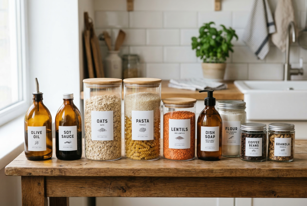 Laundry rooms, cleaning closets, and utility cabinets often become cluttered with disposable packaging, half-used bottles, and mismatched supplies. Refillable containers can help simplify these spaces while cutting down on waste.