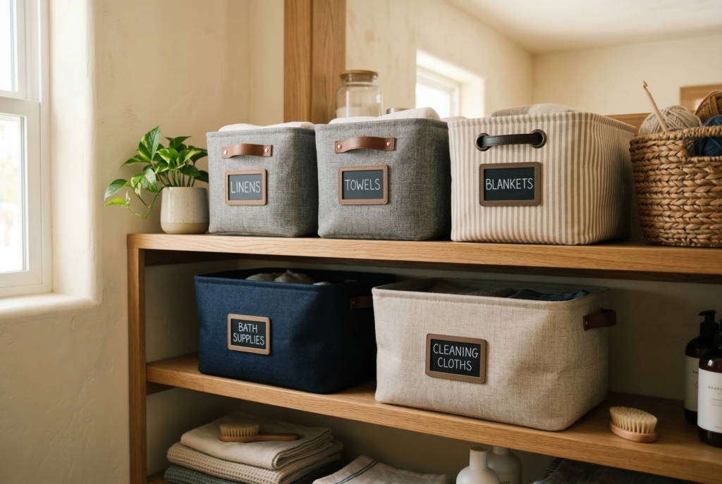 They’re especially helpful for storing clothing accessories, toys, linens, or seasonal items that don’t need rigid containers. Because they fold when not in use, they’re also easier to store than bulky hard bins. Look for bins with sturdy sides and simple shapes so they still create a clean visual effect. Neutral or earthy tones often work best for a timeless look, especially in open shelving or visible storage areas.