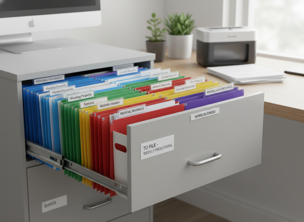 For physical documents, use labeled folders or file organizers to categorize items such as bills, medical records, tax documents, and personal paperwork. You can use a color-coded system for quick identification, or simply categorize by type of document (for example, “Insurance,” “Banking,” “Taxes”).