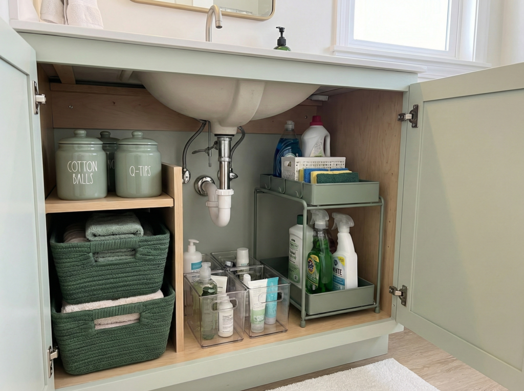 Once you’ve decluttered, it’s time to organize your items into bins. Clear plastic bins are ideal for bathroom storage because they allow you to easily see what’s inside without opening them. This is especially useful in under-sink spaces where visibility is limited.