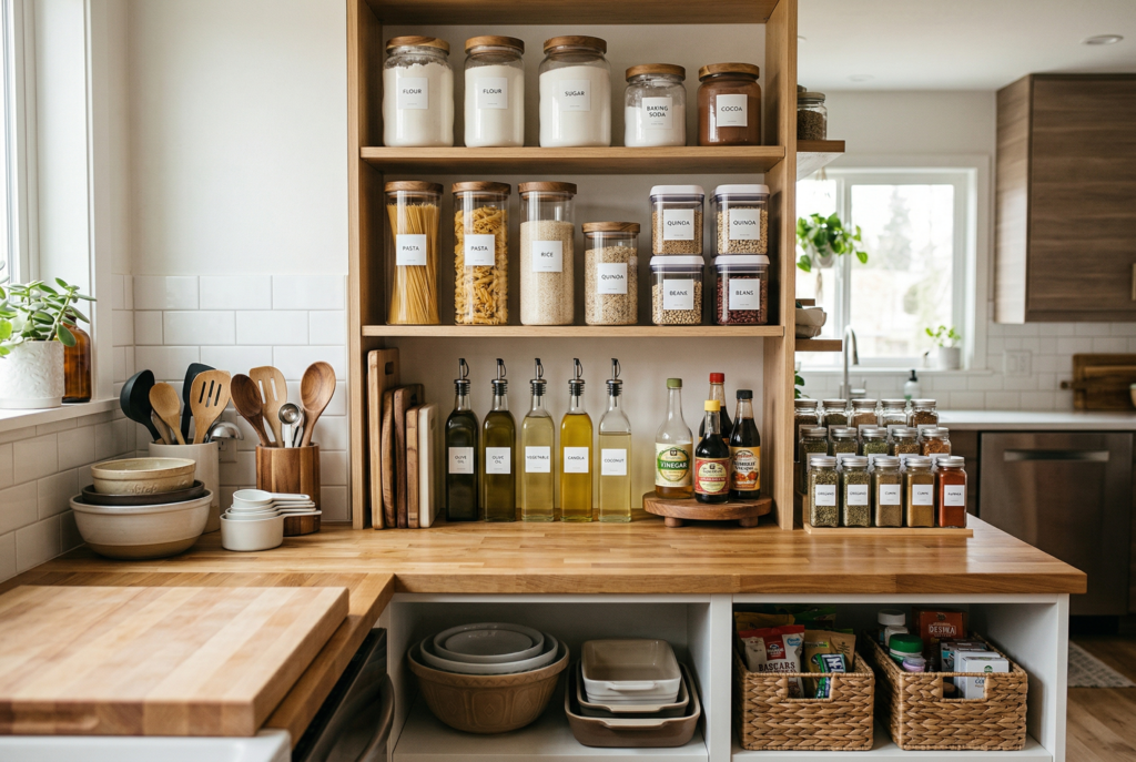 Kitchen prep tools should live near the area where meals are prepared. Cleaning supplies should be easy to reach in the rooms where they’re needed most. Daily skincare should be stored where the routine actually happens, not in an overstuffed backup drawer across the house. This kind of location-based storage makes the home feel easier to use because it reduces extra steps and keeps routines flowing more naturally.