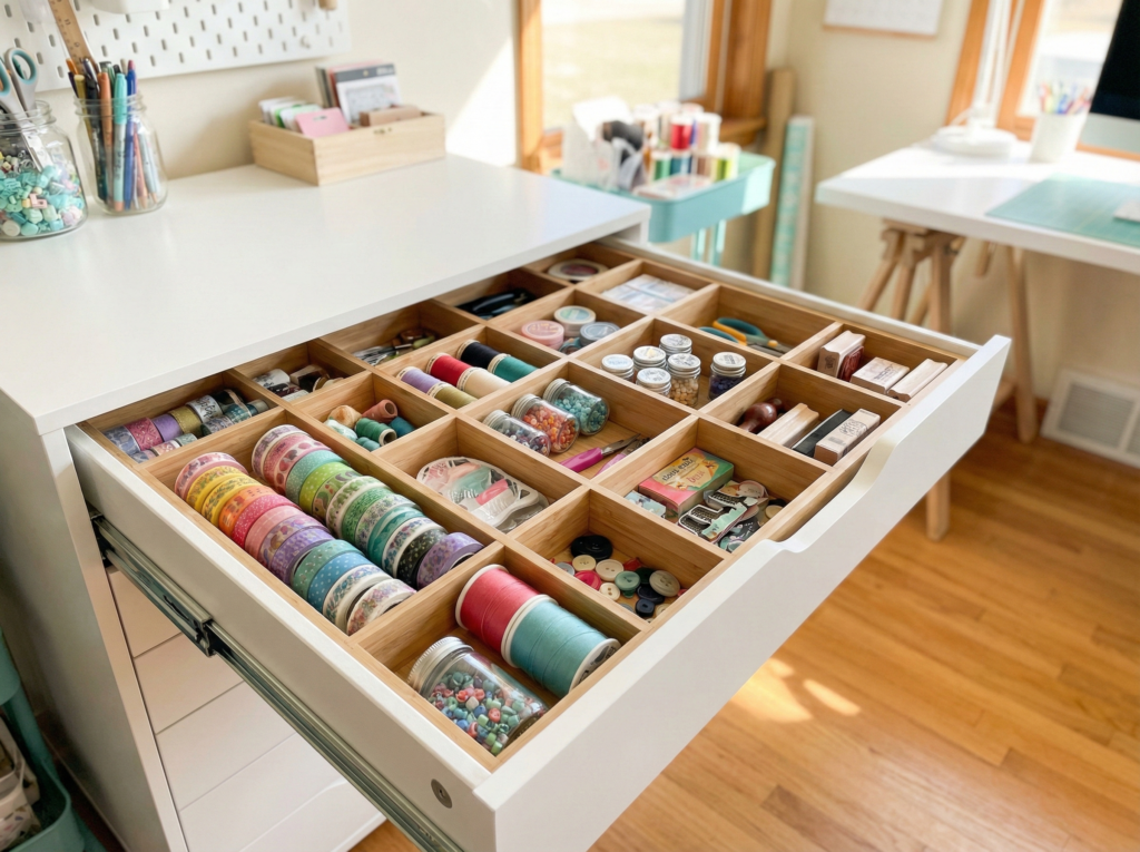 If you don’t have built-in drawers, consider using portable drawer units that you can move around your craft area as needed. This approach keeps your workspace neat and ensures that everything has a designated spot.