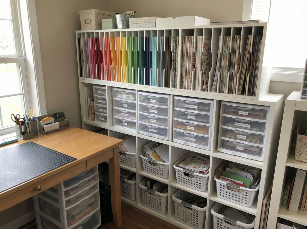 Paper storage is one of the trickiest aspects of organizing a craft room, especially if you have large quantities of scrapbook paper, cardstock, or art prints. The key is to use a system that keeps your paper flat and organized without taking up too much space.