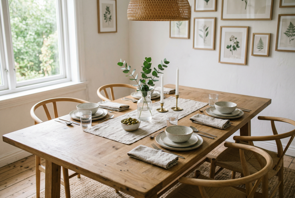 A dining table looks better and functions better when it isn’t overloaded with decor. A simple centerpiece, a bowl, a low arrangement, or a table runner may be enough to make it feel finished without taking over the usable surface.