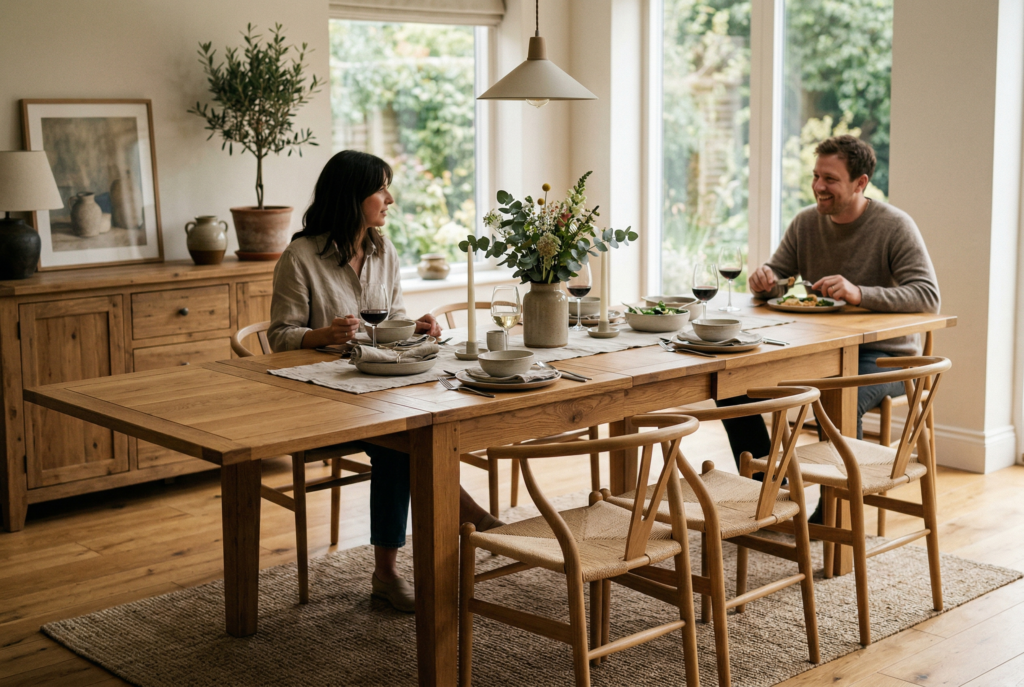 An extendable dining table works especially well for people who don’t want a large table taking over the room all the time but still want the option to host guests comfortably. This kind of design allows the table to stay compact for daily use and expand when needed for holidays, birthdays, or extra company.