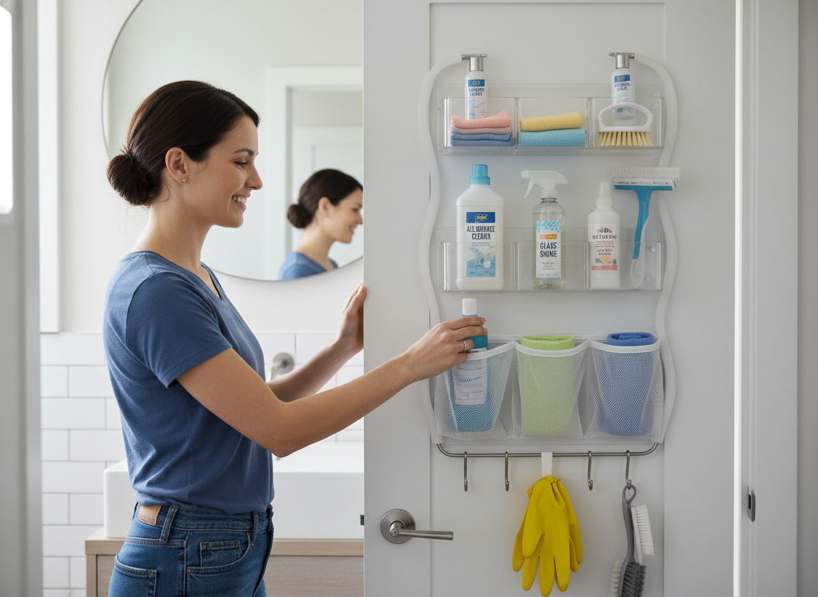 One often-overlooked storage goldmine is the back of the bathroom door or the inside of cabinet doors. These spots are perfect for storing hair tools, cleaning supplies, or extra toiletries without taking up any floor or counter space. Plus, over-the-door organizers and adhesive hooks work especially well here, making this a renter-friendly and highly effective way to add storage where you need it most.