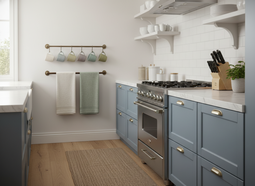 For additional storage, install hooks or racks on the inside of cabinets or on the backs of doors. You can use these hooks to hang mugs, aprons, or spatulas, while racks can hold utensils or towels.