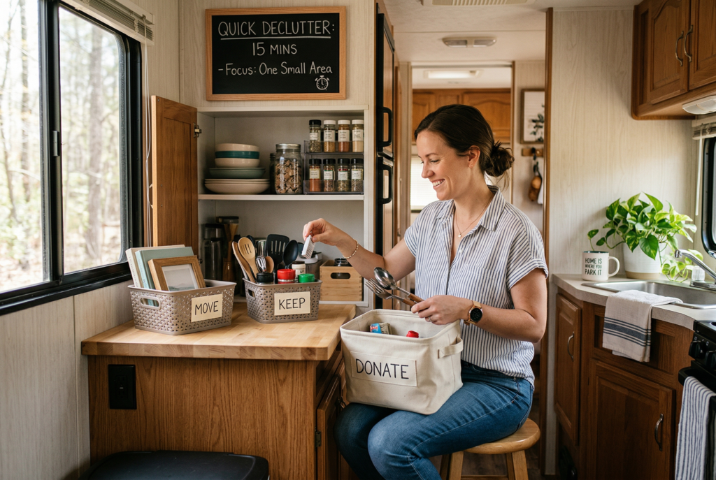 Clutter feels heavier in a mobile home because there’s less space to absorb it. That’s why regular decluttering matters so much. Instead of waiting for things to get overwhelming, it helps to use a lighter and more consistent approach.