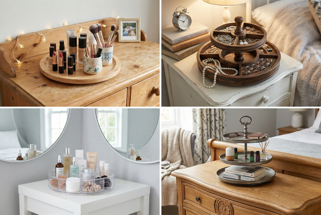 A Lazy Susan can create a compact, attractive storage solution for these items. On a dresser or closet shelf, it helps keep daily essentials together while making them easier to see. This works especially well for products you reach for while getting ready in the morning. Instead of searching through drawers or knocking things over, you can rotate the organizer and keep the area looking tidier.