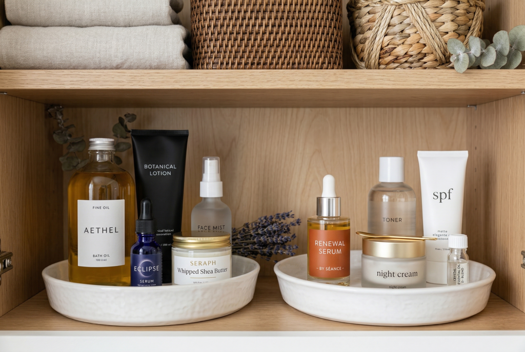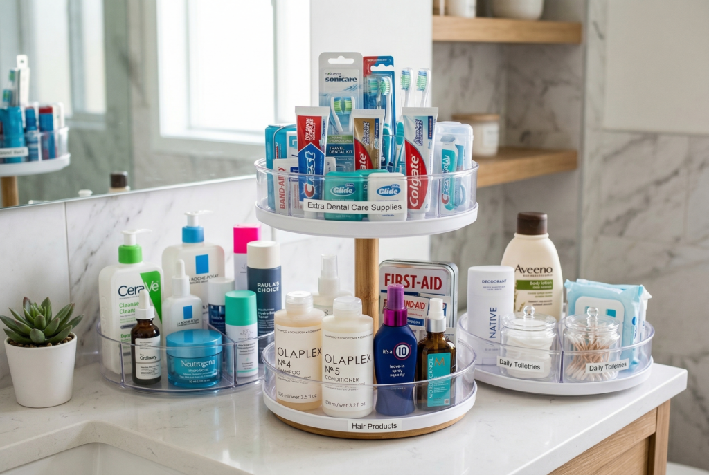 Bathrooms often hold a surprising number of small items, which is exactly why a Lazy Susan can work so well there. Skincare products, hair products, daily toiletries, first-aid items, and extra dental care supplies can all become hard to manage when they’re stored in deep cabinets or under the sink.