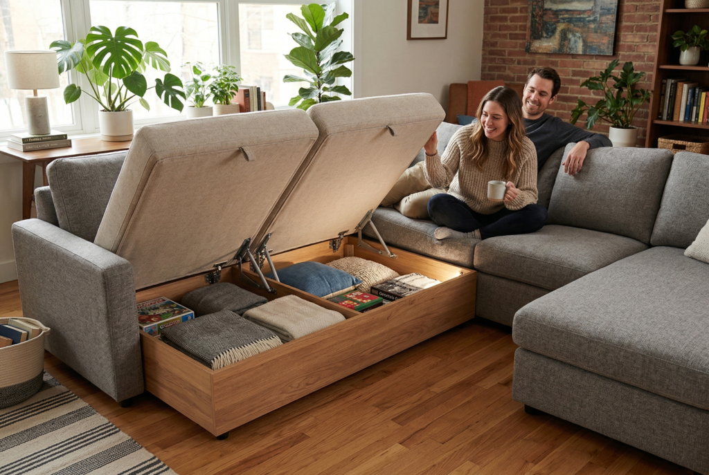 This option works especially well in family rooms where the living area gets used heavily every day. The storage keeps essentials nearby without leaving them out on display. It also helps reduce the need for extra baskets or bulky cabinets, which can make the room feel busier. When comfort and concealed storage come together in one piece, the space tends to feel calmer and more efficient.