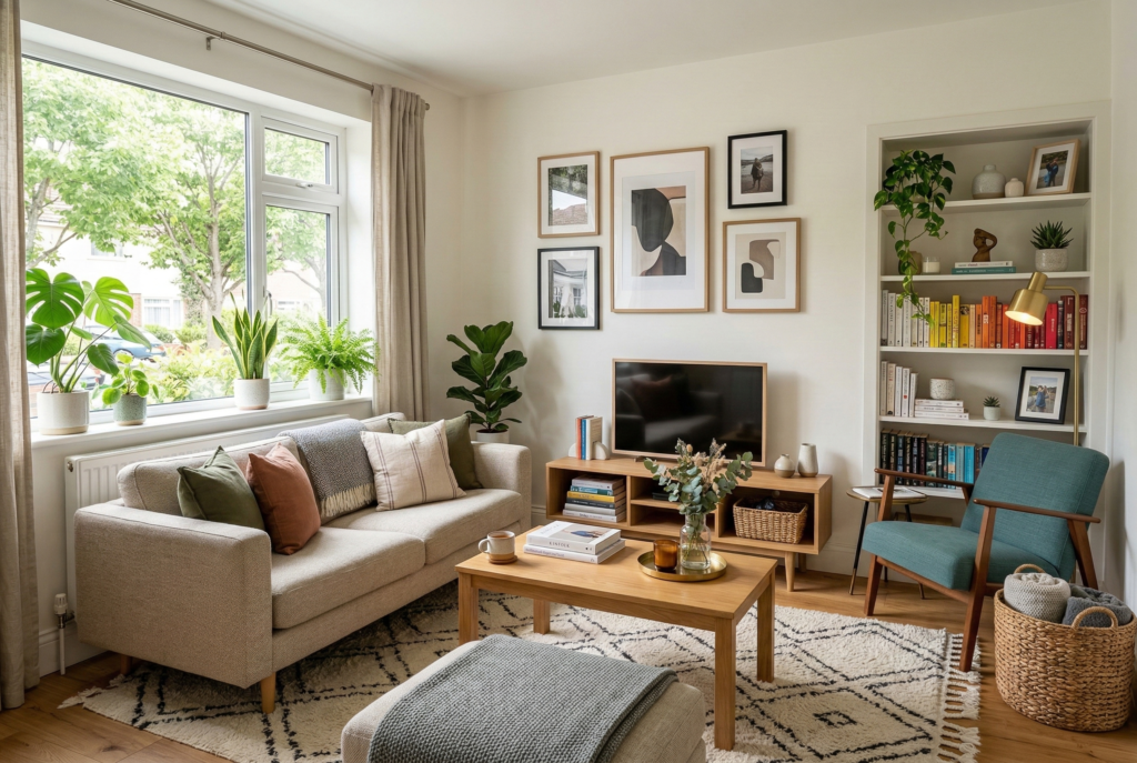 You don’t need to divide the room dramatically. Even small visual cues help. A tray on the coffee table can define where remotes and candles go. A basket beside the sofa can become the blanket zone. A corner chair with a lamp and side table can quietly become a reading nook instead of a catch-all.