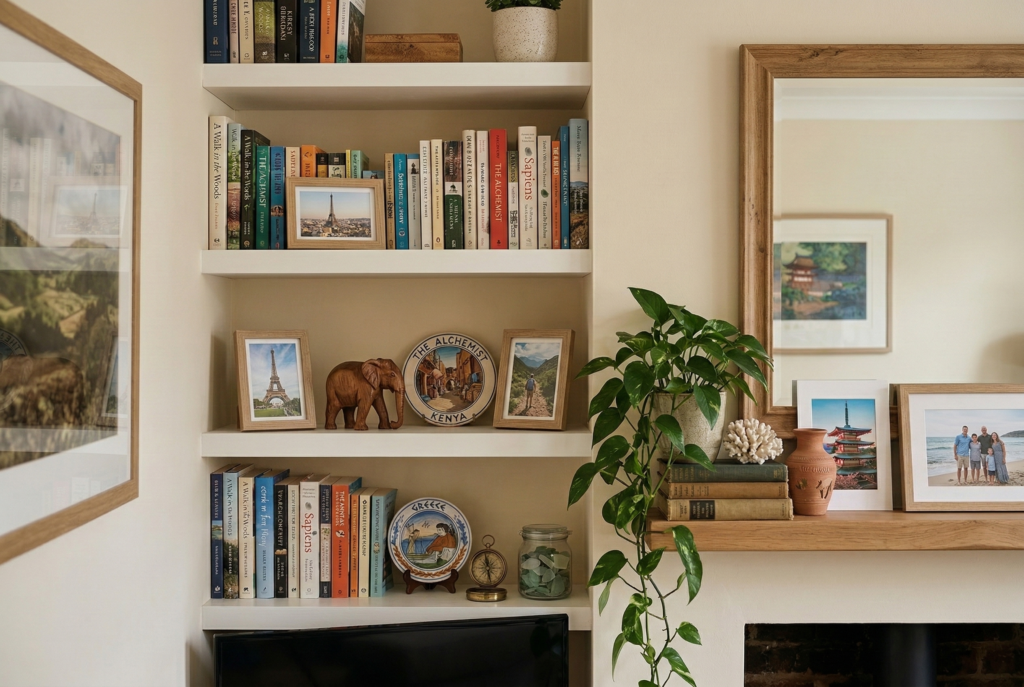 The trick is curation. Not everything has to be out at once. Rotate pieces seasonally or whenever shelves start to feel crowded. Let a few meaningful items breathe instead of covering every surface with decor.