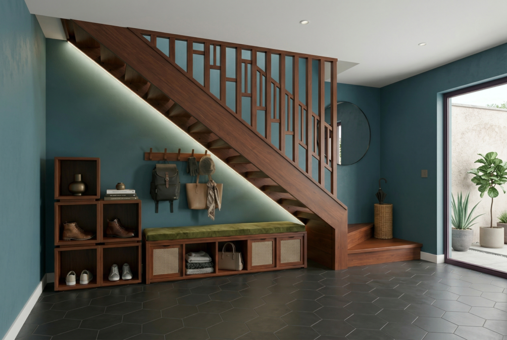 If your staircase sits near the front door, the area underneath it can become an excellent entryway storage zone. This is one of the smartest under stairs storage ideas because it helps contain the clutter that usually collects right where people come and go.
