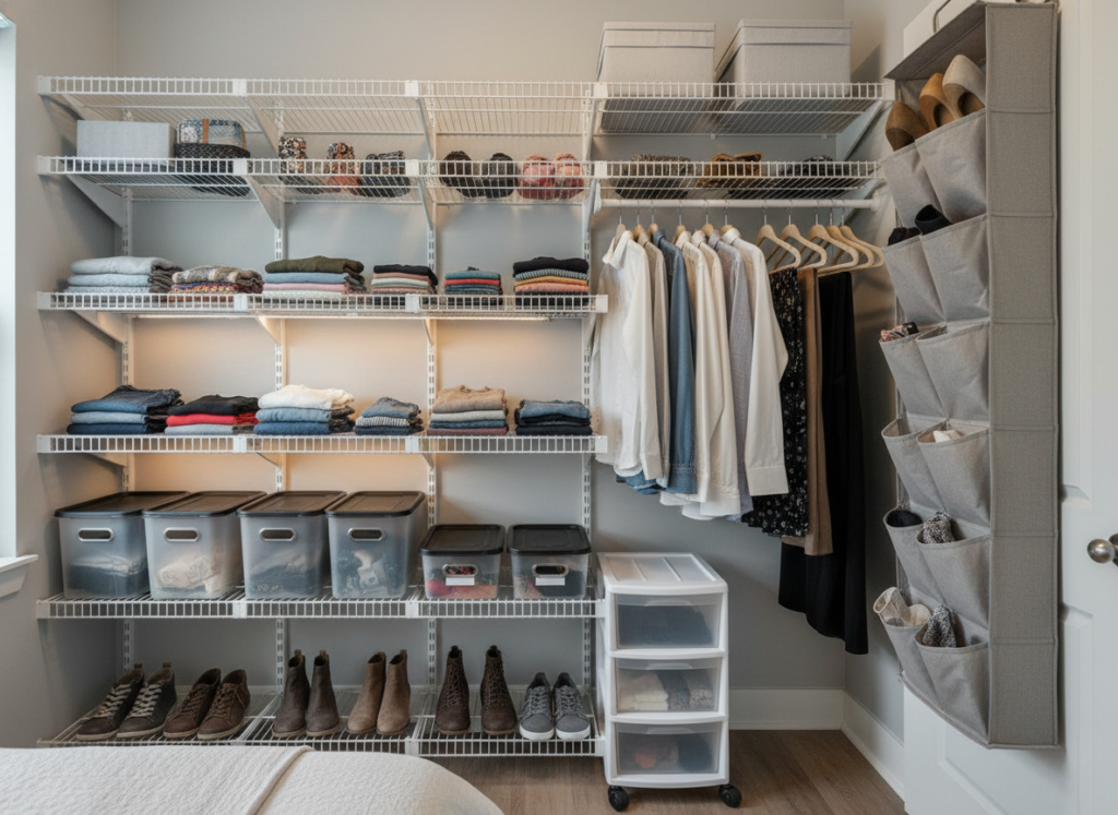 Storage bins are perfect for keeping your items organized and easy to find. Look for bins that are clear, so you can see what’s inside without digging through them. Use them for storing out-of-season clothes, extra linens, or shoes you don’t wear frequently.