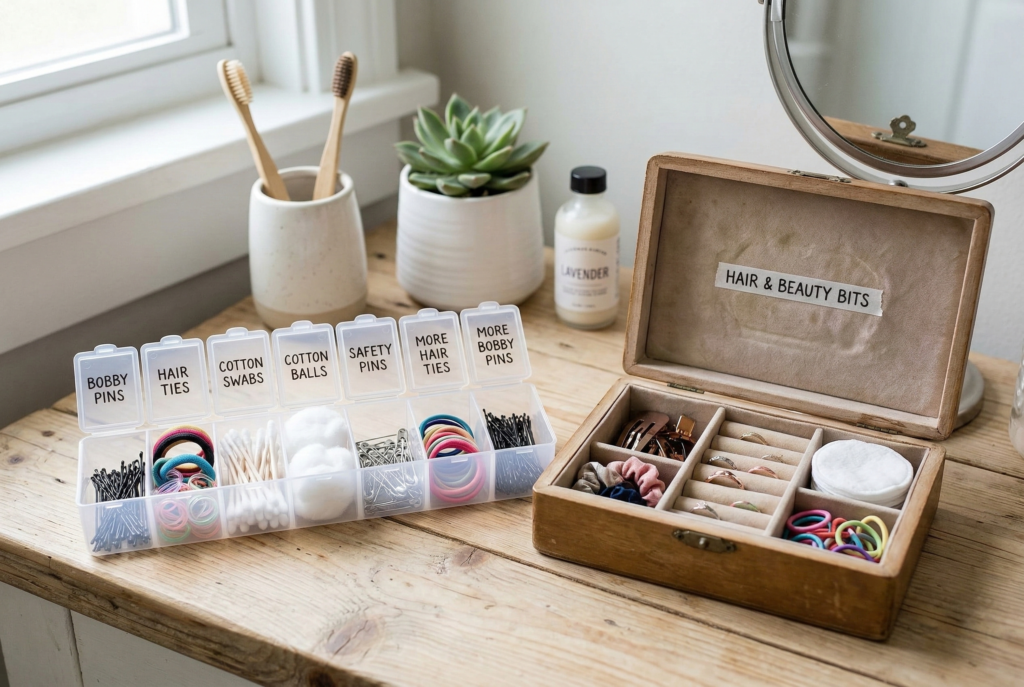 In a bathroom drawer, you might use an old pillbox or a small jewelry box to organize items like bobby pins, hair ties, or cotton balls. For a kitchen drawer, a repurposed container can be used to hold packets of spices, tea bags, or even measuring spoons.