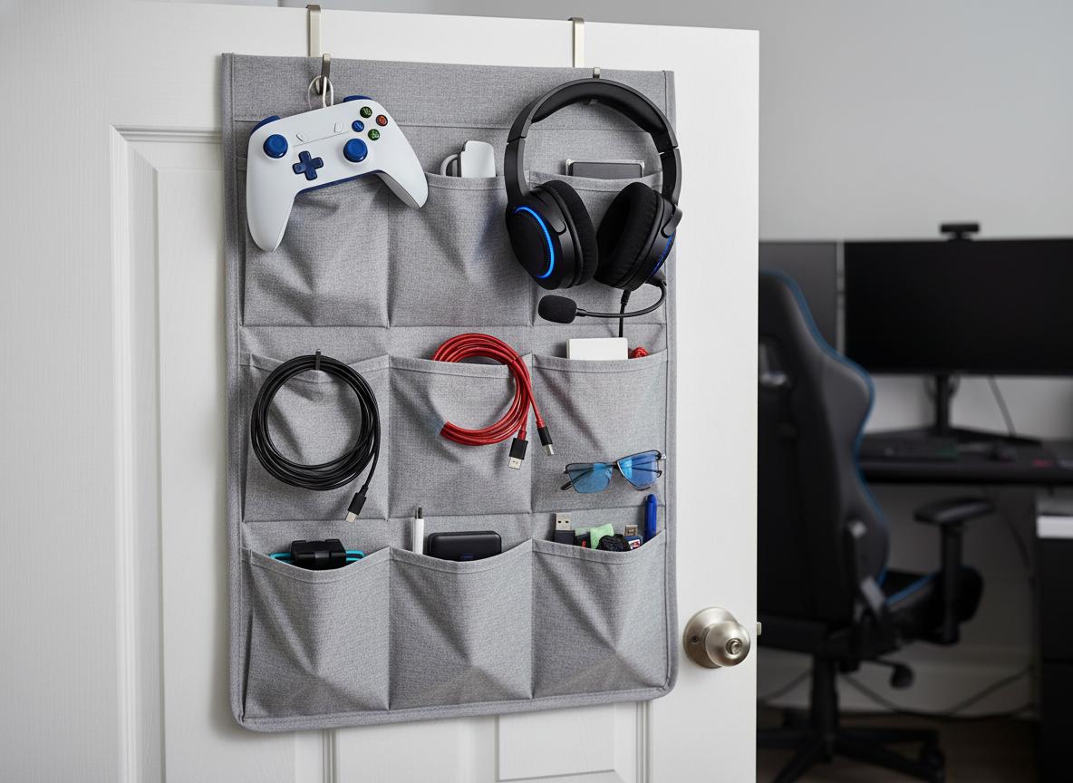 Small-space idea: hang a door-mounted organizer to hold handheld controllers, headsets, and other gadgets.