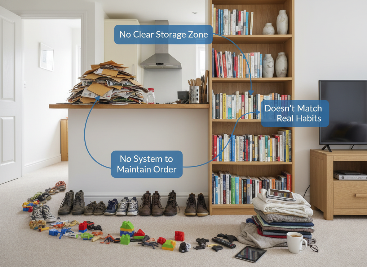 Clutter isn’t about owning “too much.” Instead, it’s usually the result of poor systems. When items don’t have clear storage spaces, tidy routines are hard to maintain, or your setup doesn’t match your family’s daily habits, clutter naturally builds up.
