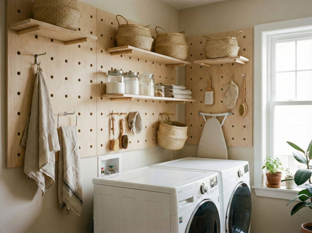 You can also hang towels or drying racks for quick access. Having a pegboard in your laundry room will help you maintain a neat and tidy space, ensuring that everything is within reach and organized, reducing the chaos often associated with laundry day.
