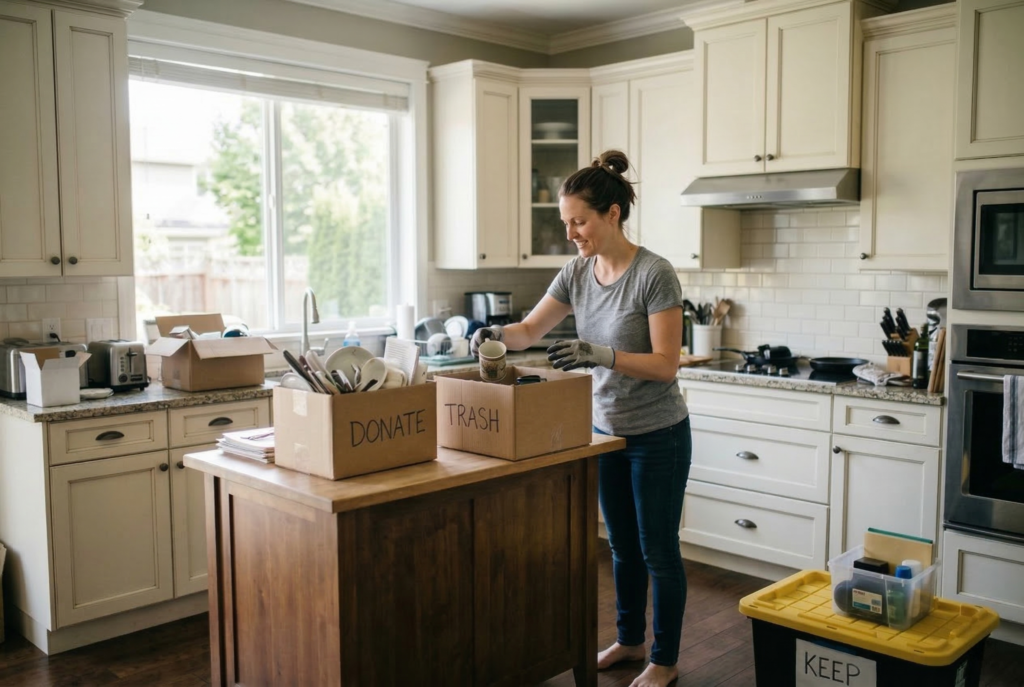 In the kitchen, watch for duplicate utensils, expired pantry items, random containers without lids, and gadgets you never use. These often move quickly into trash, recycle, or donate. In the bedroom, the biggest wins often come from clothing, accessories, books, papers, and items that were dropped there temporarily. The relocate category is usually especially helpful here.
